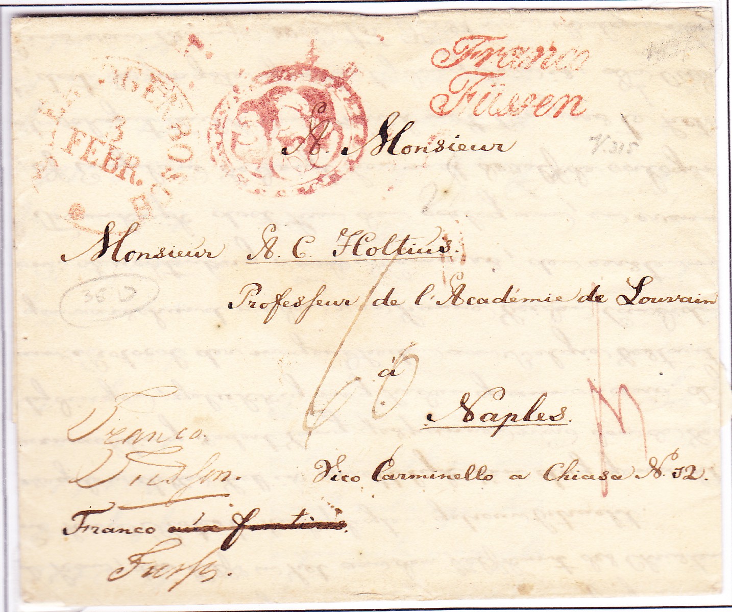Brief von 1831 aus S´Hertogenbosch in den Niederlanden nach Neapel. Entsprechend den Postverträgen musste er bis Füssen frankiert werden und erhielt in Verviers, an der preussisch-niederländischen Grenze, den Stempel „Franco Füssen“.